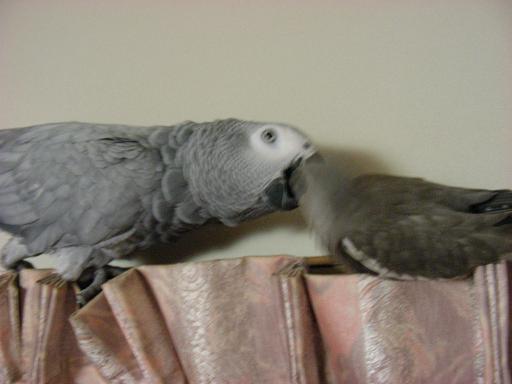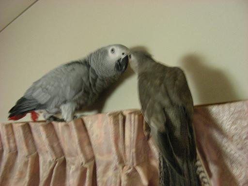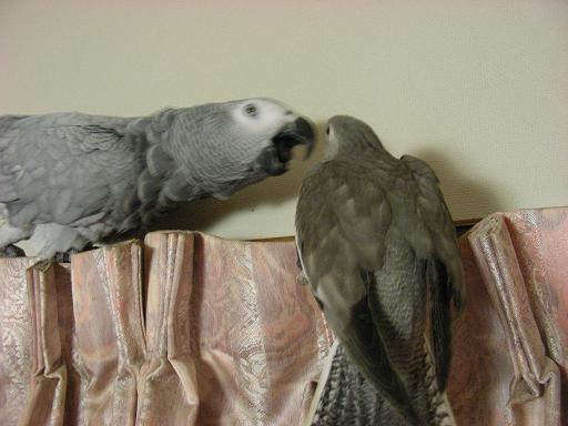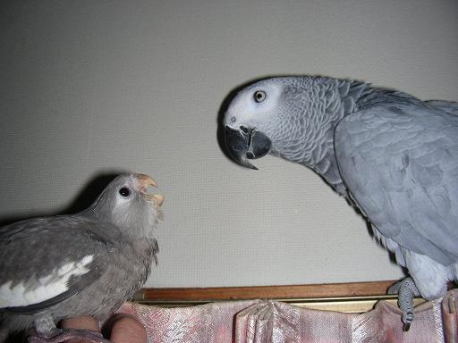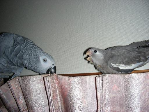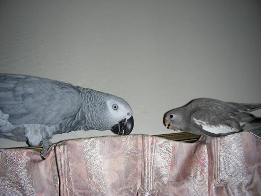ココロ@ヨウム♀とWFDSちゃん、同じ色だけど親子じゃないのよね。