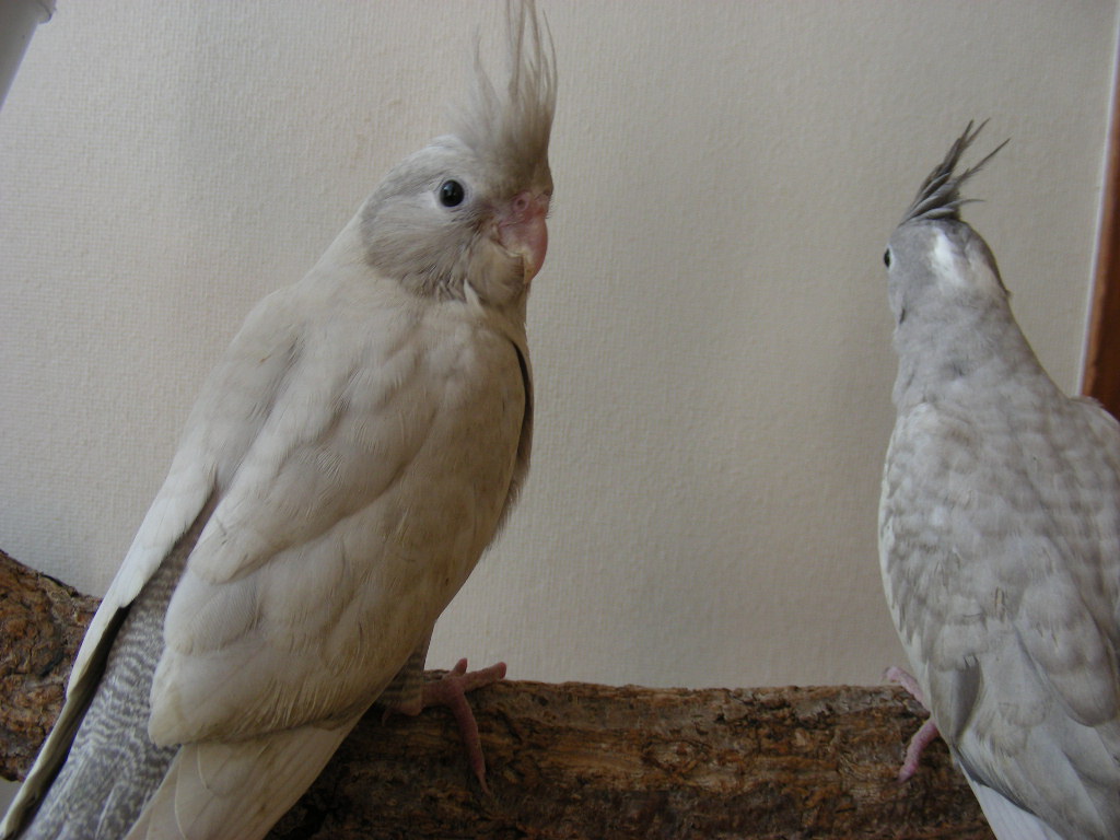良く鳴いておしゃべりしようとしたり、他の鳥に足をかけたりするので♂っぽい行動をしています。